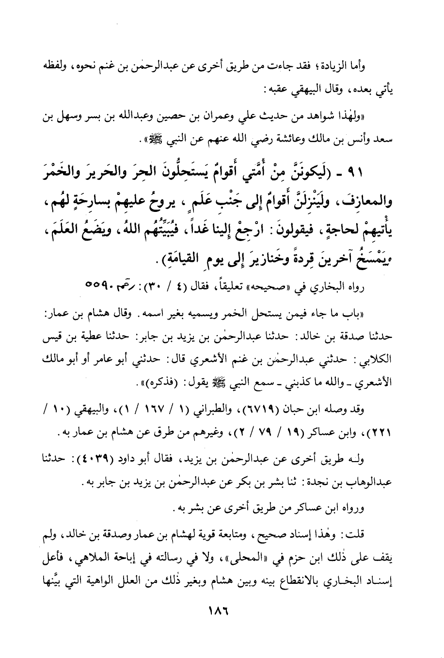 91 - " ليكونن من أمتي أقوام يستحلون الحر والحرير والخمر والمعازف، ولينزلن