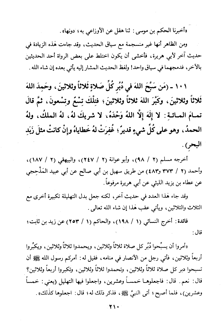 101 - " من سبح الله في دبر كل صلاة ثلاثا وثلاثين وحمد الله ثلاثا وثلاثين وكبر