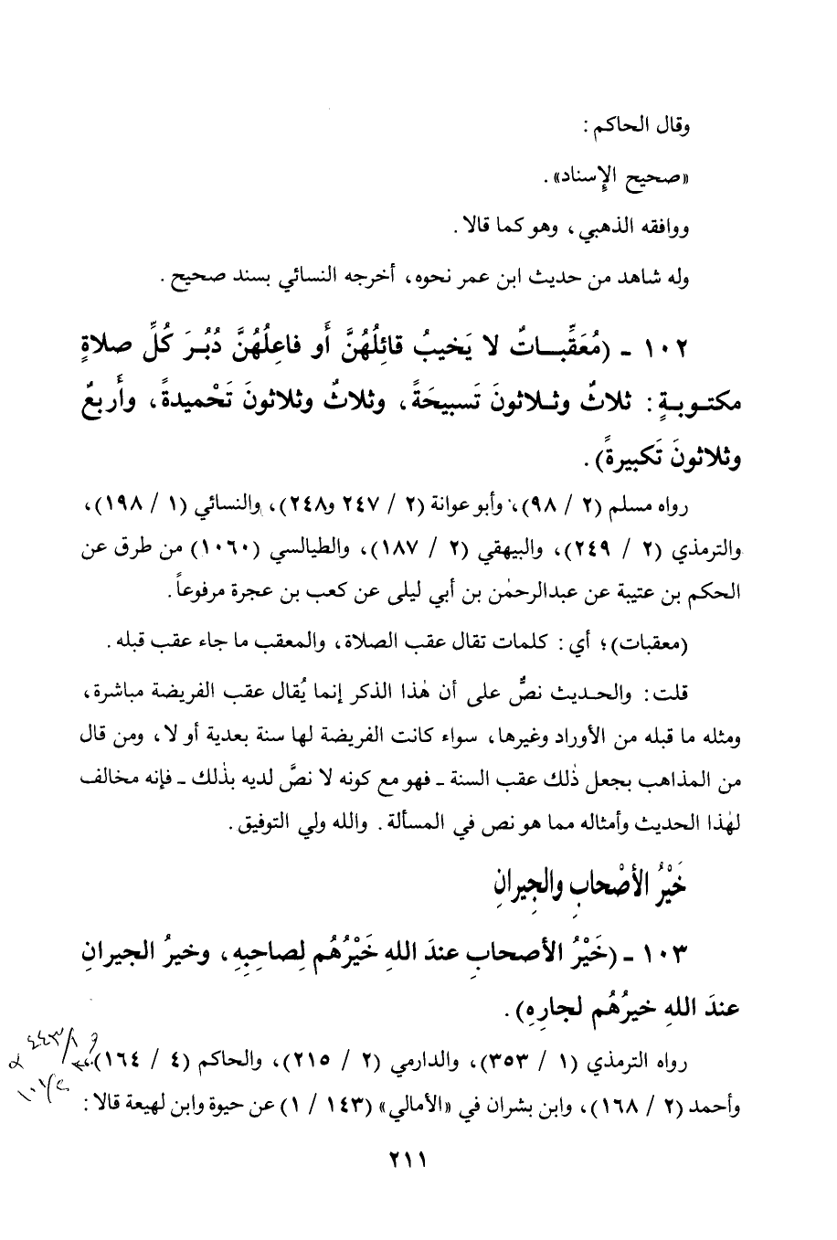 102 - " معقبات لا يخيب قائلهن أو فاعلهن دبر كل صلاة مكتوبة: ثلاث وثلاثون تسبيحة