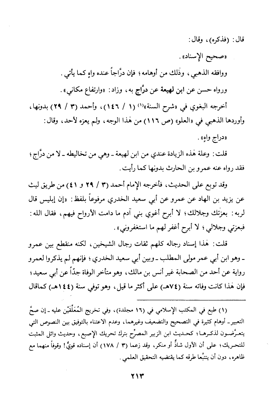 قلت: وعلة هذه الزيادة عندي من ابن لهيعة وهي من تخاليطه لا من دراج، فقد