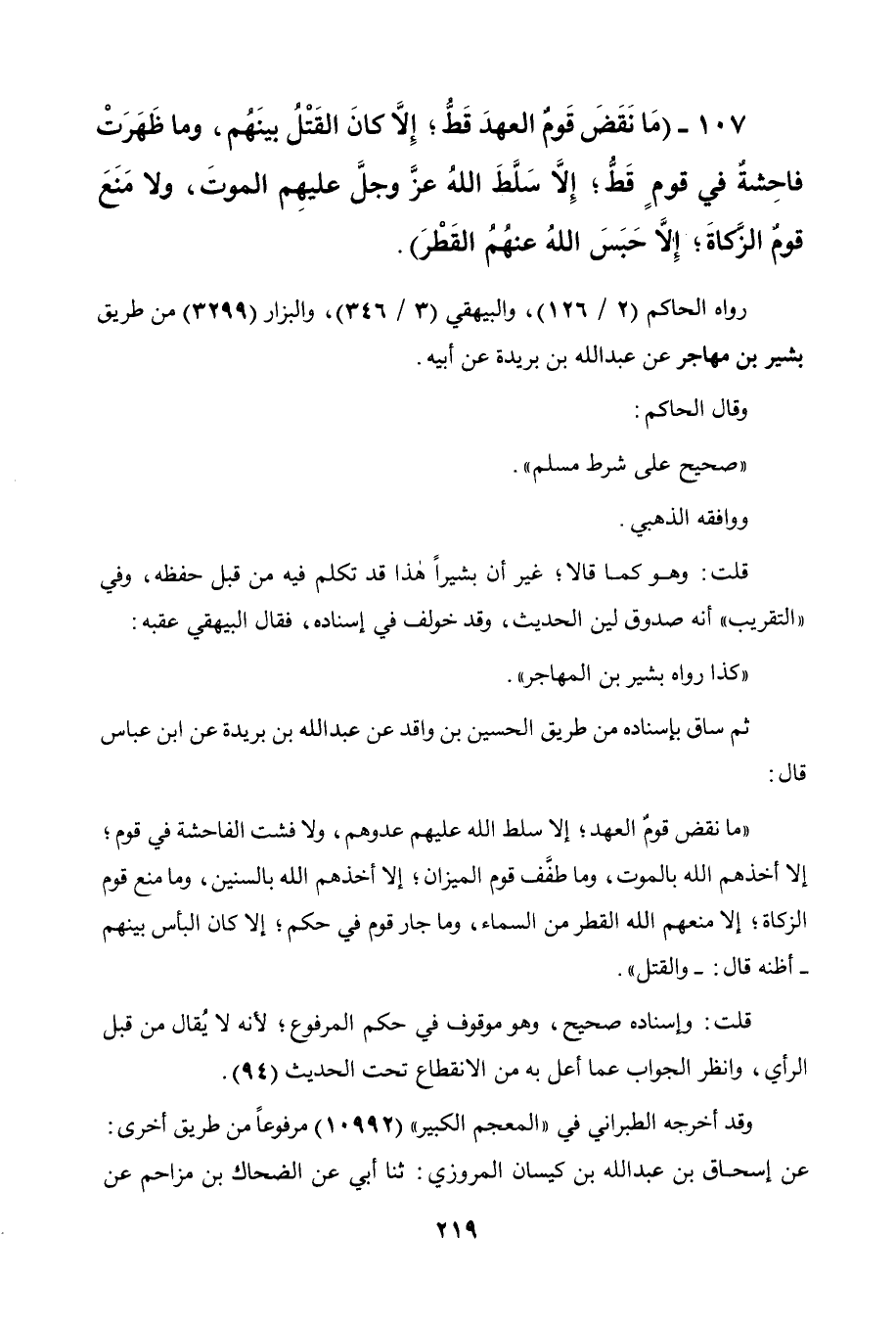 107 - " ما نقض قوم العهد قط إلا كان القتل بينهم، وما ظهرت فاحشة في قوم قط إلا