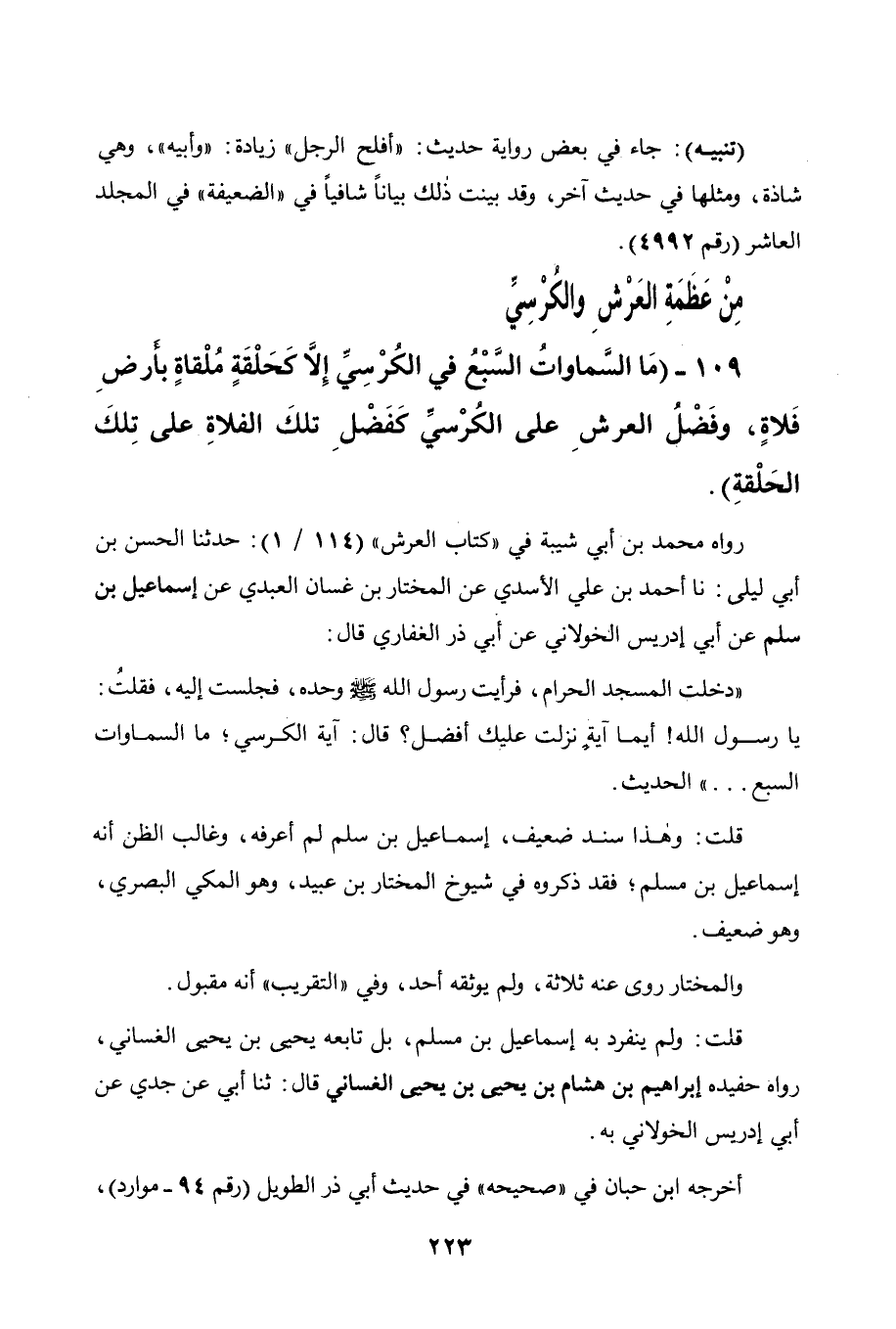 109 - " ما السموات السبع في الكرسي إلا كحلقة ملقاة بأرض فلاة وفضل العرش على