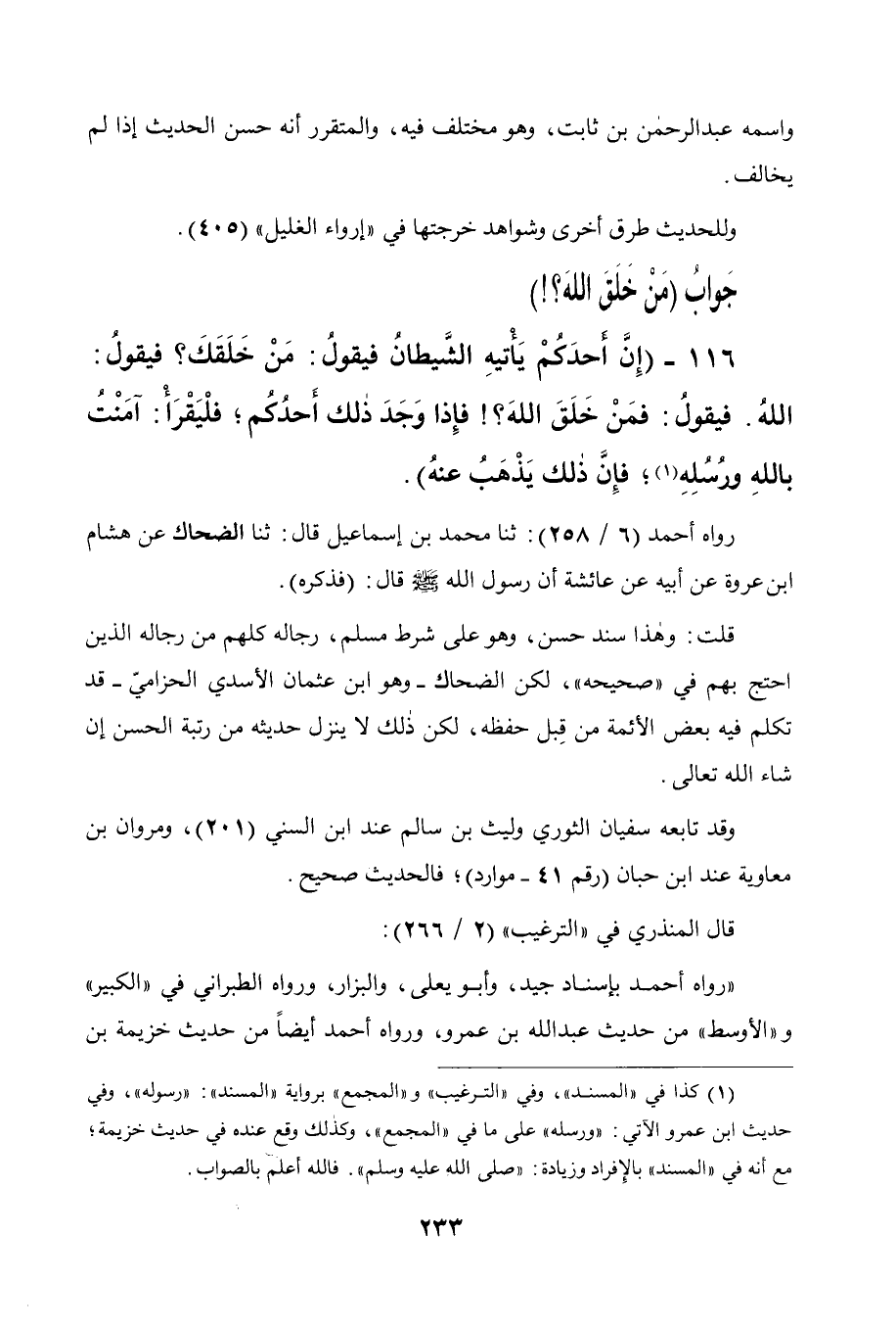 116 - " إن أحدكم يأتيه الشيطان فيقول: من خلقك؟ فيقول: الله، فيقول: فمن خلق