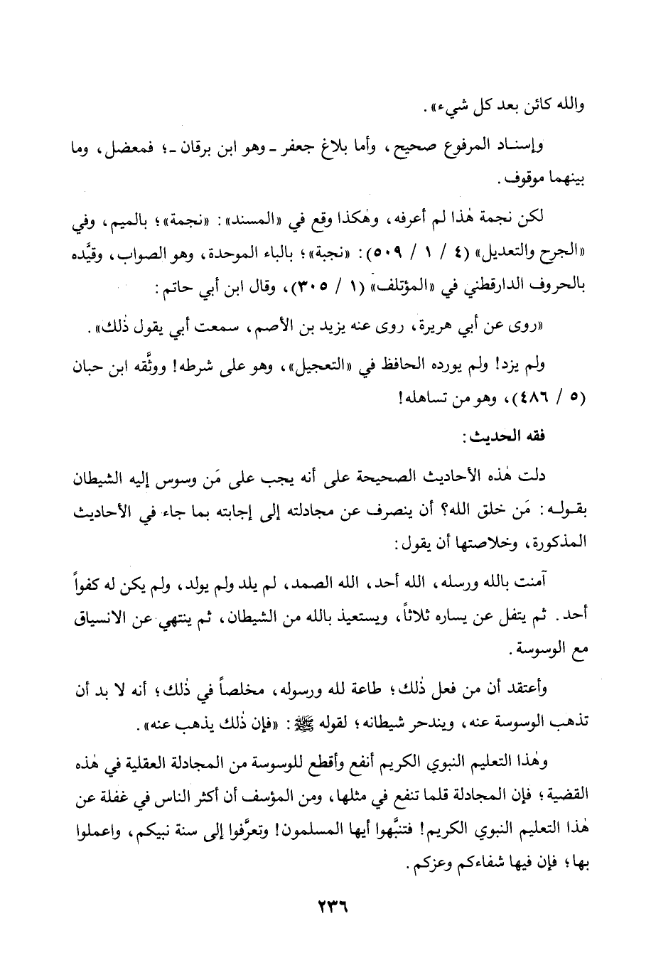 وهذا التعليم النبوي الكريم أنفع وأقطع للوسوسة من المجادلة العقلية في هذه