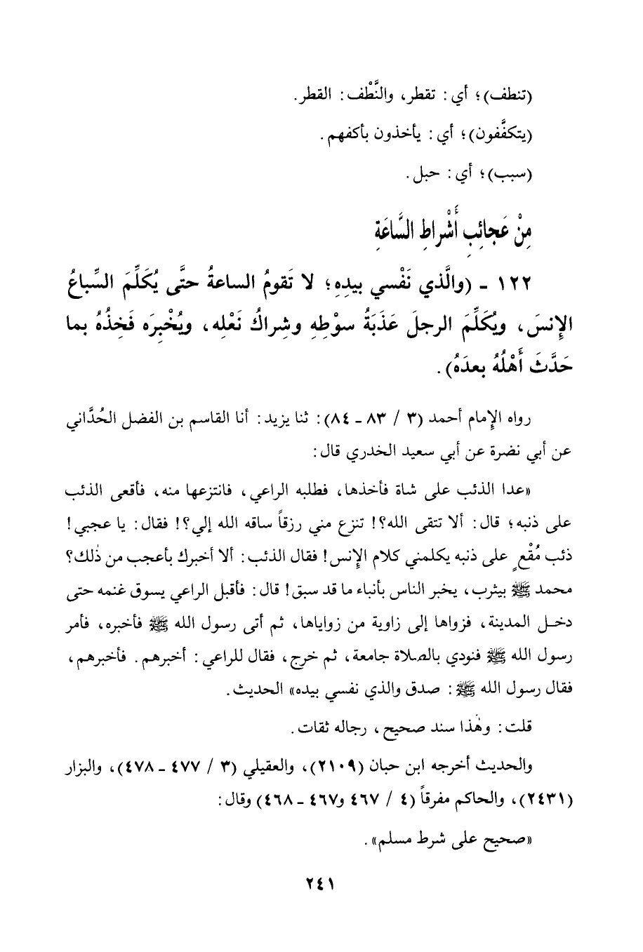 122 - " والذي نفسي بيده لا تقوم الساعة حتى يكلم السباع الإنس ويكلم الرجل عذبة