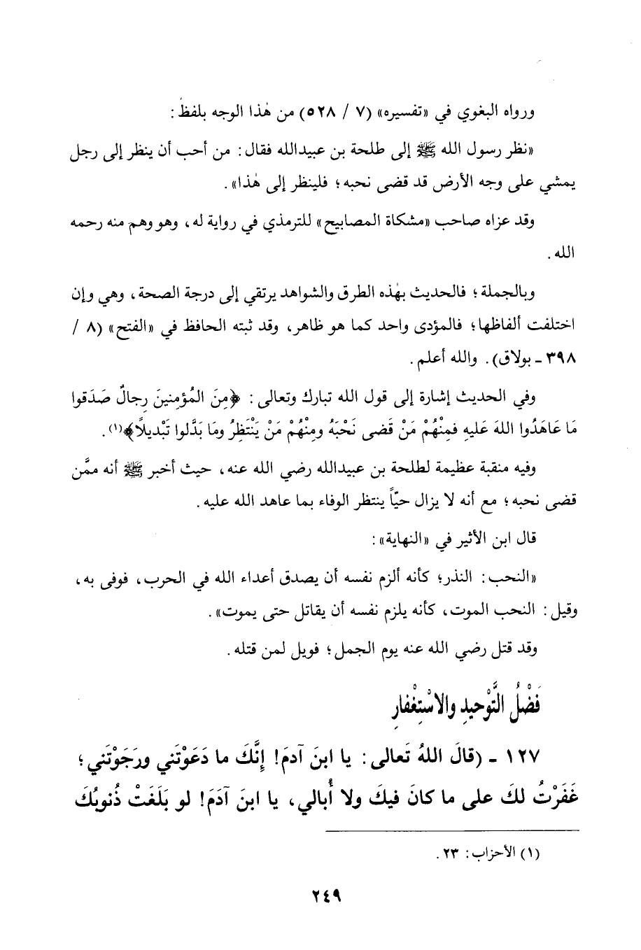 وقيل: النحب الموت، كأنه يلزم نفسه أن يقاتل حتى يموت ".