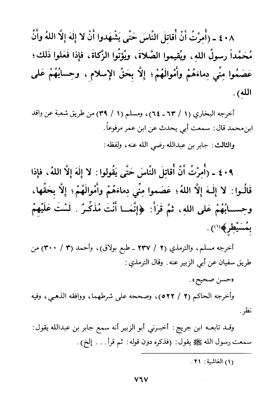 408 - " أمرت أن أقاتل الناس حتى يشهدوا أن لا إله إلا الله وأن محمدا رسول الله