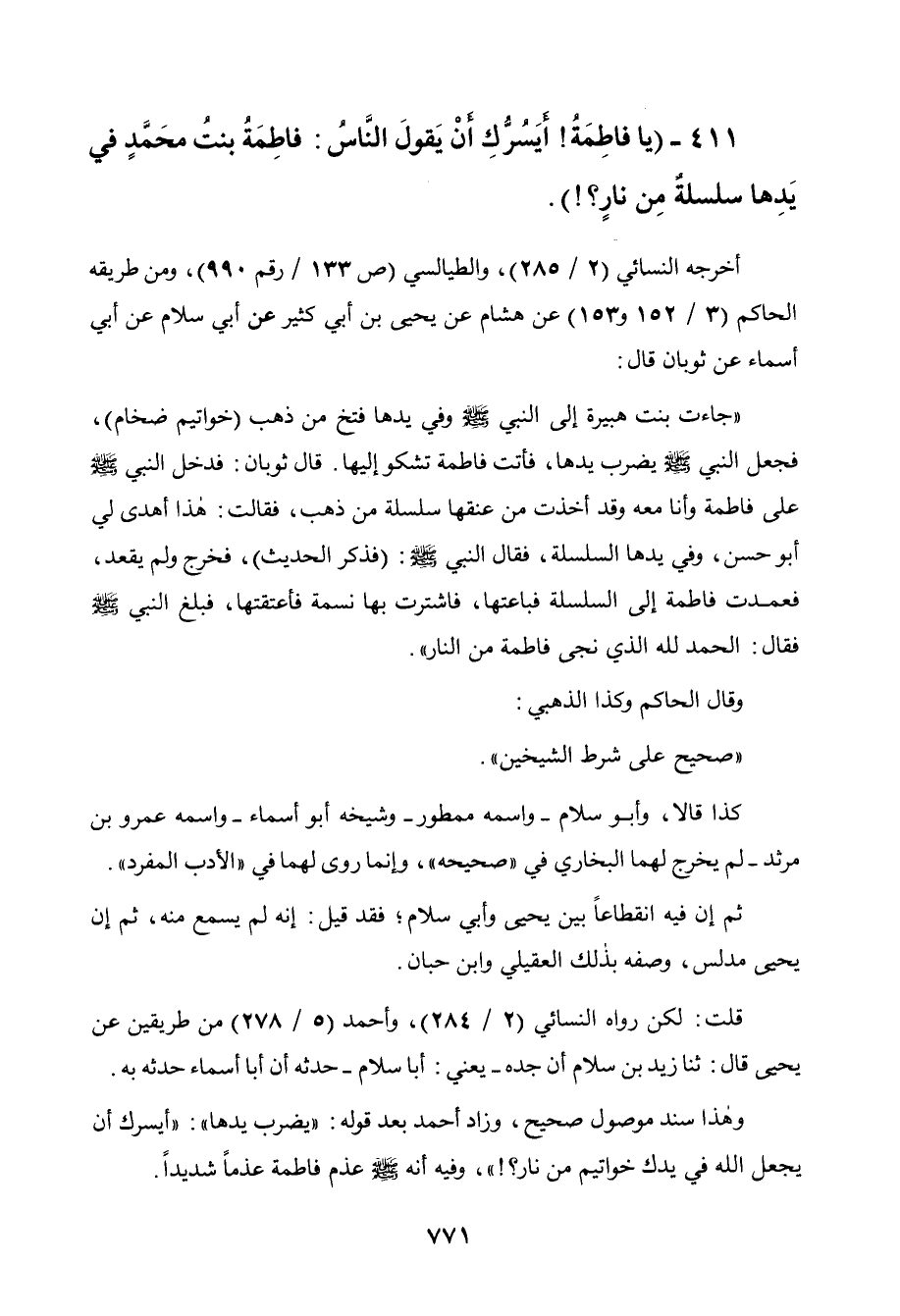 411 - " يا فاطمة أيسرك أن يقول الناس: فاطمة بنت محمد في يدها سلسلة من نار؟! ".