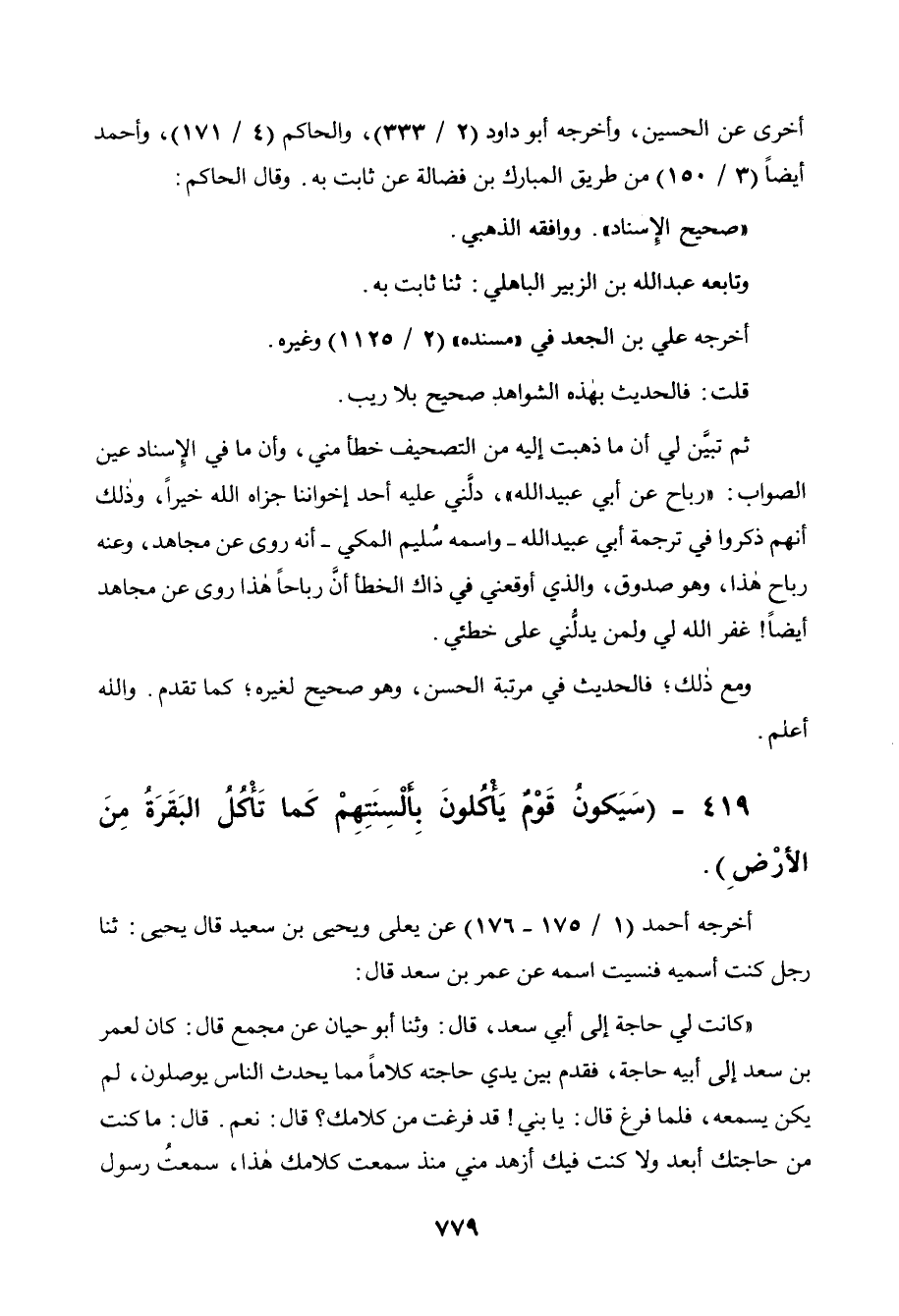 419 - " سيكون قوم يأكلون بألسنتهم، كما تأكل البقرة من الأرض ".