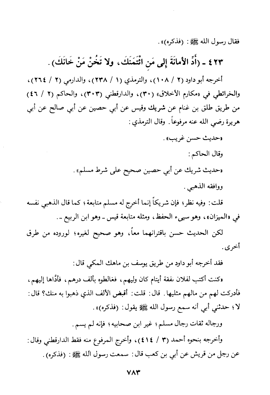 423 - " أد الأمانة إلى من ائتمنك، ولا تخن من خانك ".