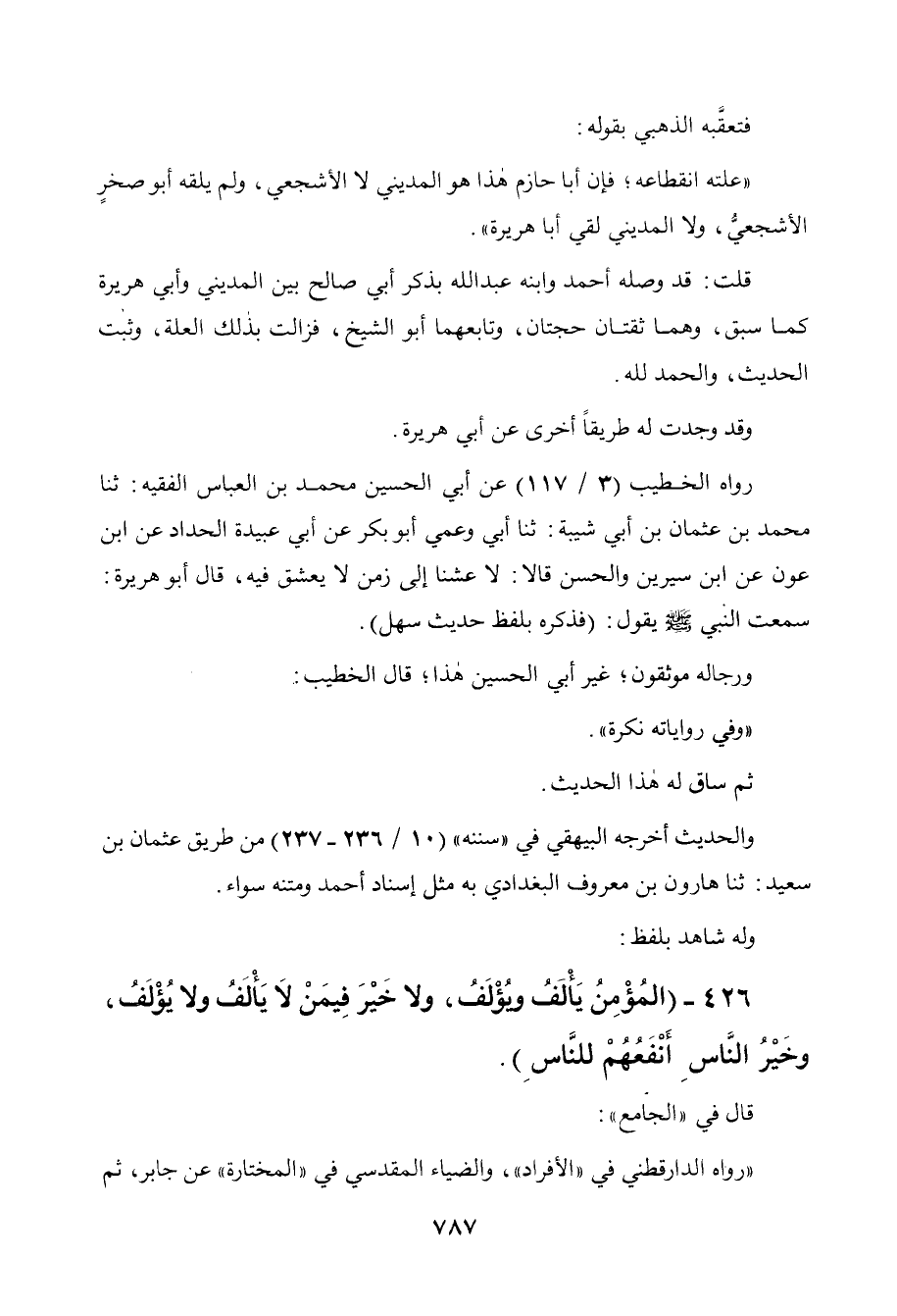 426 - " المؤمن يألف ويؤلف ولا خير فيمن لا يألف، ولا يؤلف وخير الناس أنفعهم