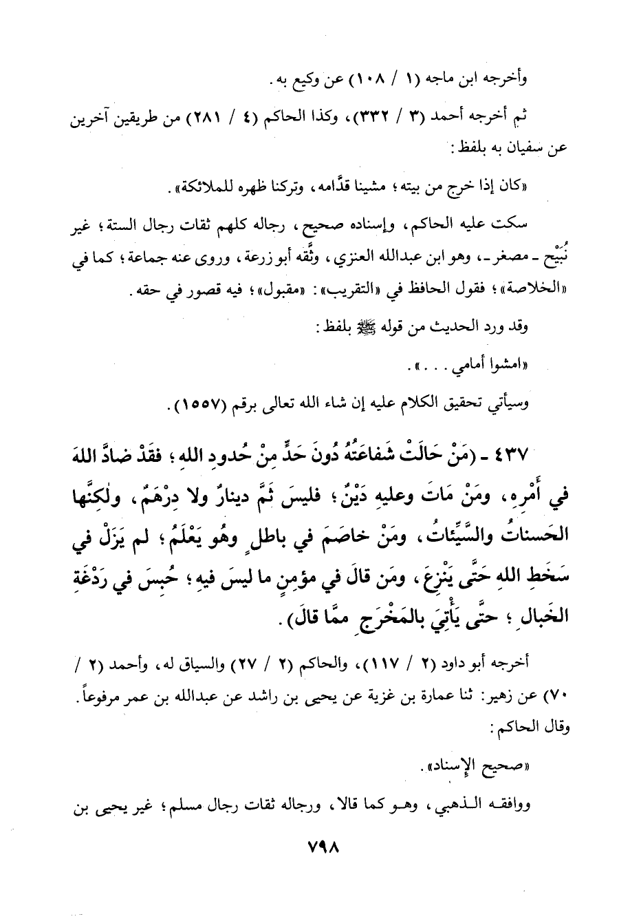 437 - " من حالت شفاعته دون حد من حدود الله فقد ضاد الله في أمره، ومن مات وعليه