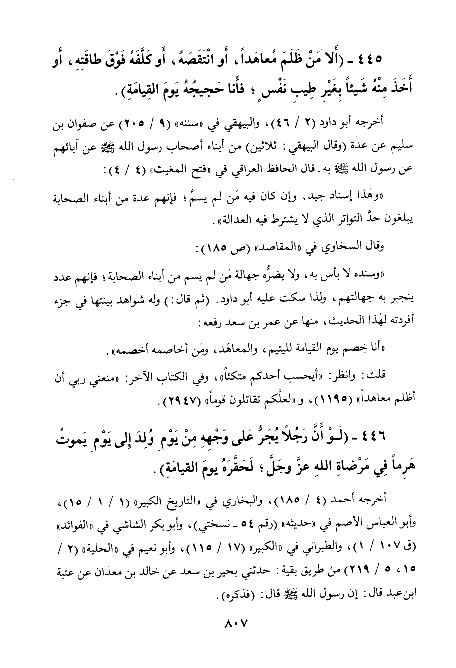 445 - " ألا من ظلم معاهدا، أو انتقصه، أو كلفه فوق طاقته، أو أخذ منه شيئا بغير