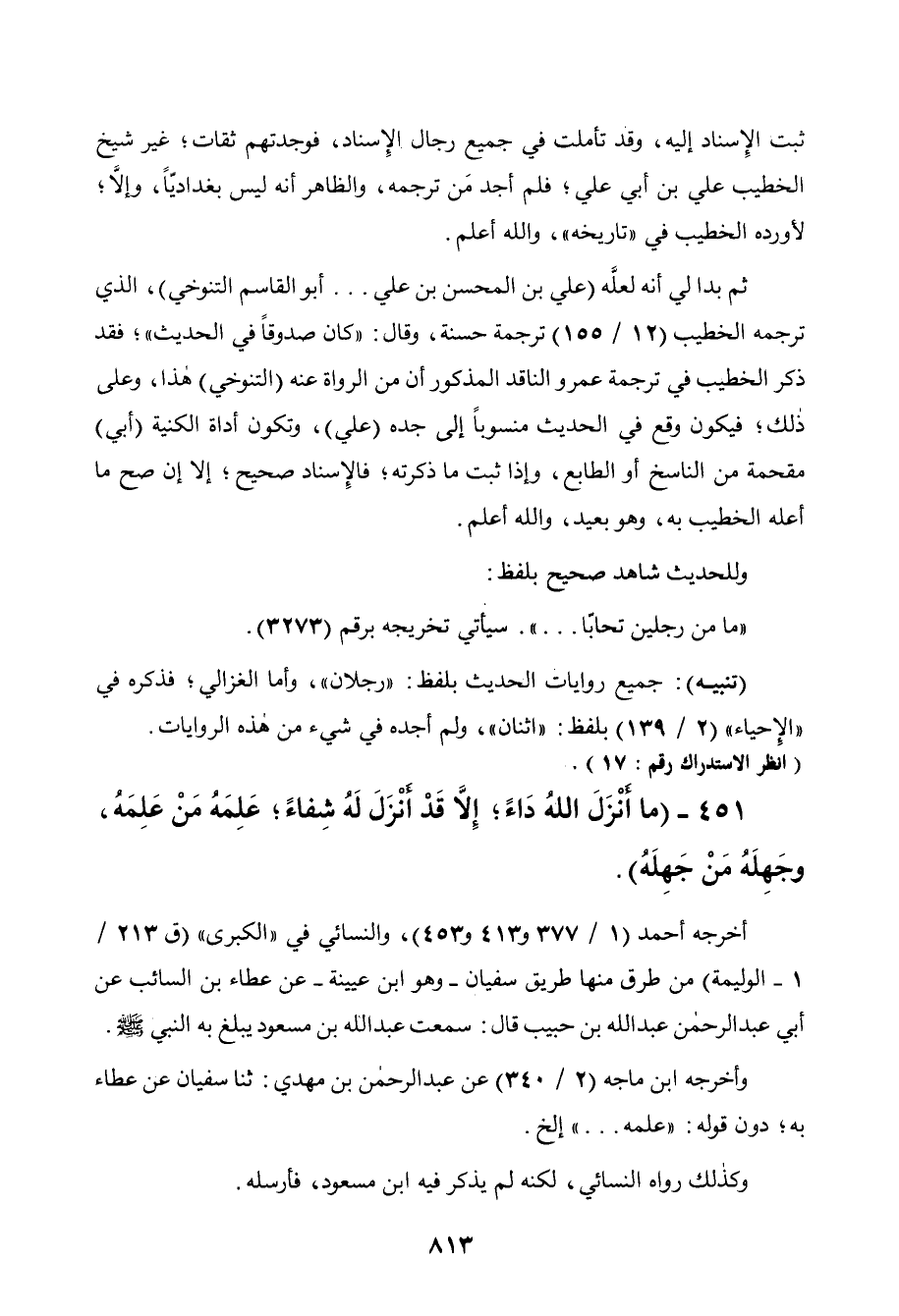 451 - " ما أنزل الله داء، إلا قد أنزل له شفاء، علمه من علمه، وجهله من جهله ".