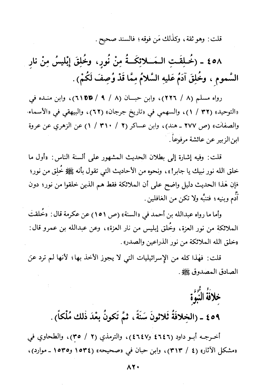 458 - " خلقت الملائكة من نور وخلق إبليس من نار السموم وخلق آدم عليه السلام مما