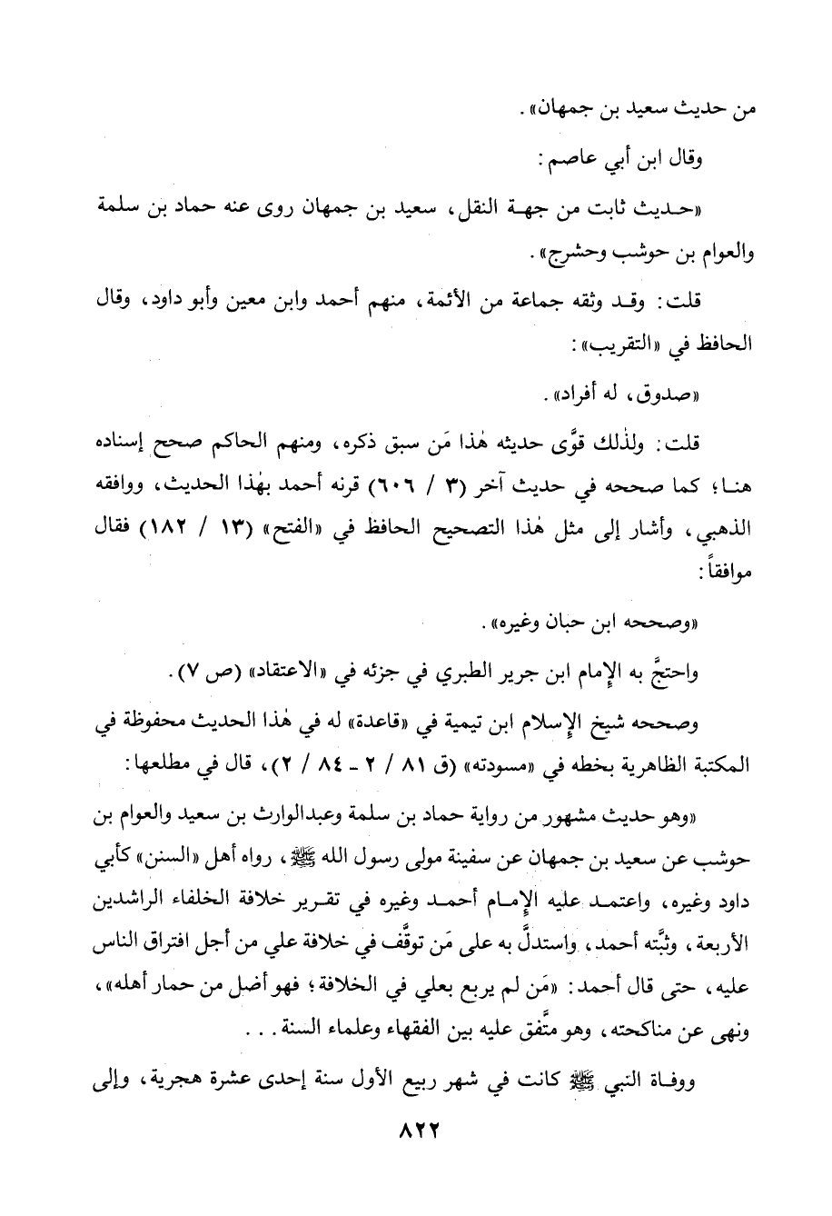 وقال ابن أبي عاصم: " حديث ثابت من جهة النقل، سعيد بن جمهان روى عنه حماد