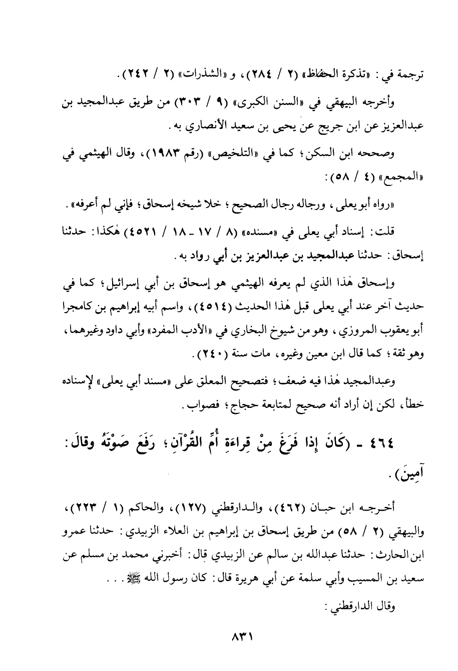 464 - " كان إذا فرغ من قراءة أم القرآن رفع صوته، وقال: (آمين) ".