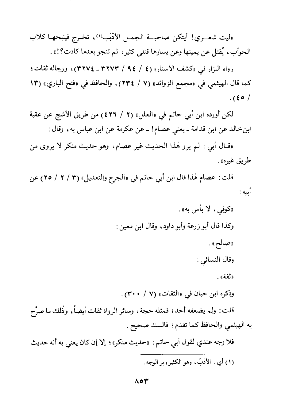 قلت: عصام هذا قال ابن أبي حاتم في " الجرح والتعديل " (3 / 2 / 25) عن