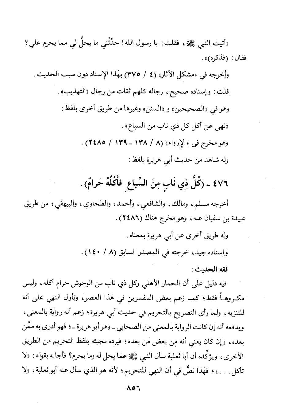 476 - " كل ذي ناب من السباع فأكله حرام ".