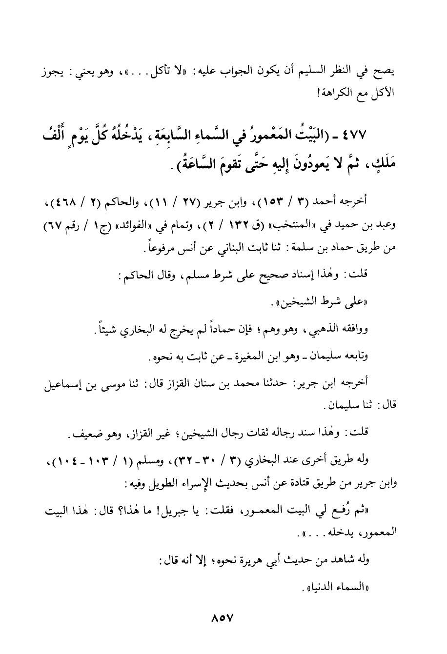 477 - " البيت المعمور في السماء السابعة يدخله كل يوم ألف ملك، ثم لا يعودون إليه
