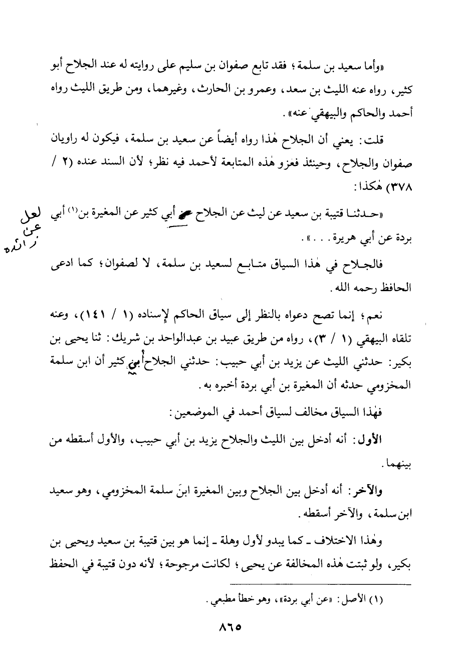 فالجلاح في هذا السياق متابع لسعيد بن سلمة، لا لصفوان كما أدعى الحافظ