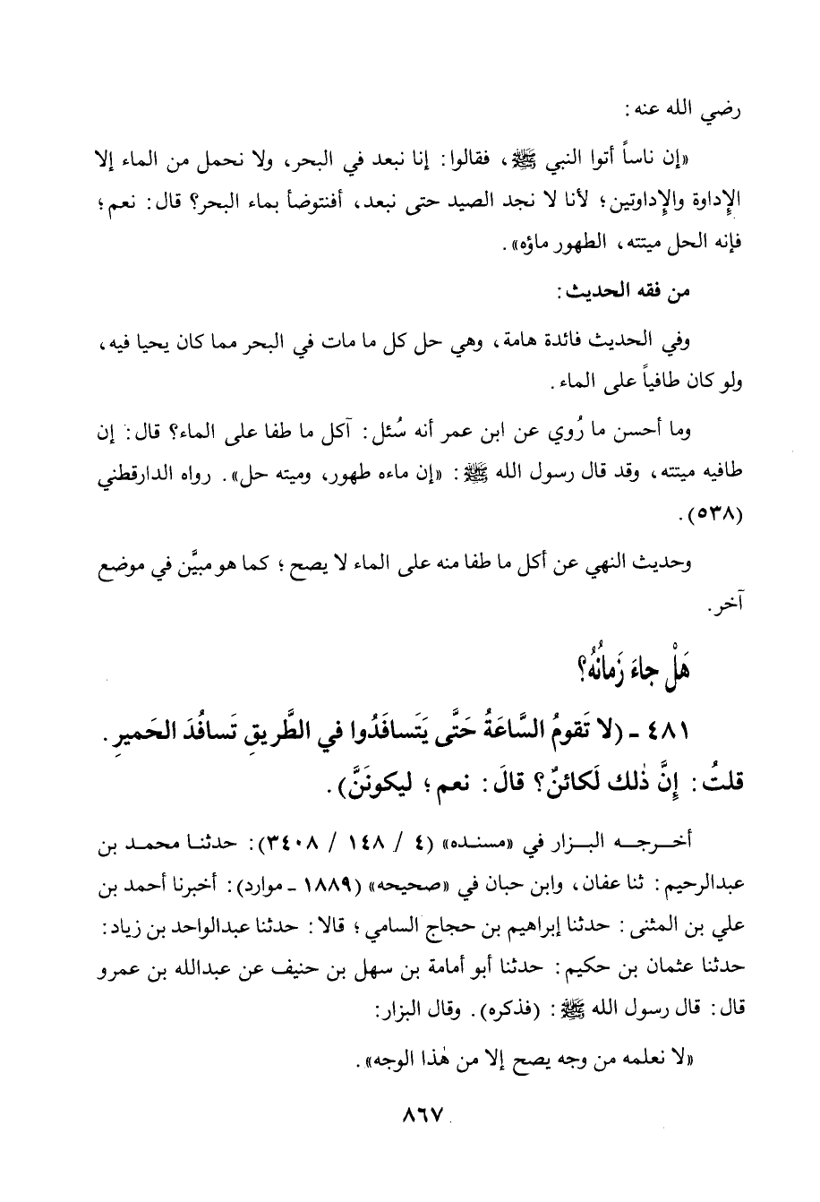 بماء البحر؟ قال: نعم فإنه الحل ميتته، الطهور ماؤه ".