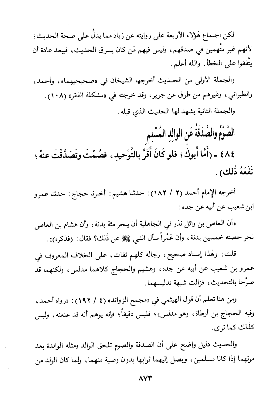 484 - " أما أبوك فلو كان أقر بالتوحيد، فصمت وتصدقت عنه نفعه ذلك ".