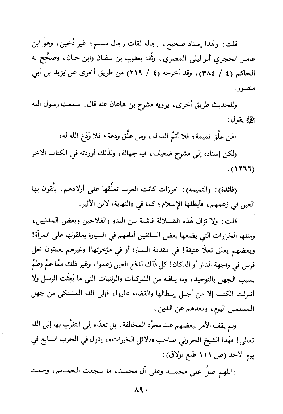 " من علق تميمة فلا أتم الله له، ومن علق ودعة، فلا ودع الله له ".