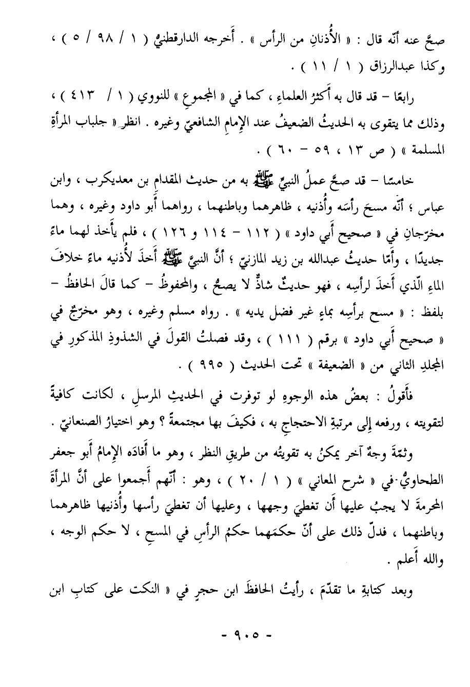 خامسًا - قد صحَّ عملُ النبيِّ - صلى الله عليه وسلم - به من حديث المقدامِ بن معد يكرب، وابن عباس، أنّه مسحَ رأسَه وأُذنيه، ظاهرهما وباطنهما، رواهما أبو داود وغيره، وهما مخرّجانِ في "صحيح أَبي داود" (112-114 و126) ، فلم يأَخذ لهما ماءً جديدًا، وأَمّا حديثُ عبد الله بن زيد المازنيّ، أنَّ النبيَّ - صلى الله عليه وسلم - أَخذَ لأُذنيه ماءً خلافَ الماءِ الّذي أَخذَ لرأسِه، فهو حديثٌ شاذٌّ لا يصحُّ، والمحفوظُ -كما قالَ الحافظُ- بلفظ: "مسح برأسِه بماءٍ غير فضل يديه". رواه مسلم وغيره، وهو مخرّجٌ في "صحيح أَبي داود" برقم (111) ، وقد فصلتُ القولَ في الشذوذِ المذكورِ في المجلدِ الثاني من "الضعيفة" تحت الحديث (995) .