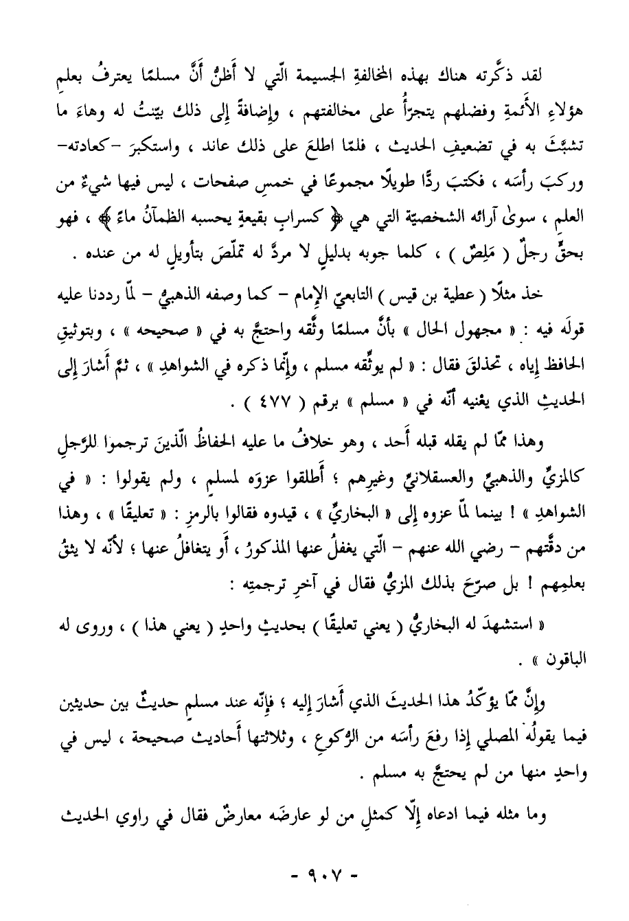 خذ مثلًا (عطة بن قيس) التابعيّ الإِمام -كما وصفه الذهبيُّ- لماّ رددنا عليه قولَه فيه: " مجهول الحال " بأنَّ مسلمًا وثَّقه واحتجَّ به فى "صحيحه"، وبتوثيقِ الحافظ إِياه، تحذلقَ فقال: " لم يوثِّقه مسلم، وإِنّما ذكره فىِ الشواهدِ "، ثمَّ أَشارَ إِلى الحديثِ الذي يعْنيه أنّه فى " مسلم " برقم (477) .