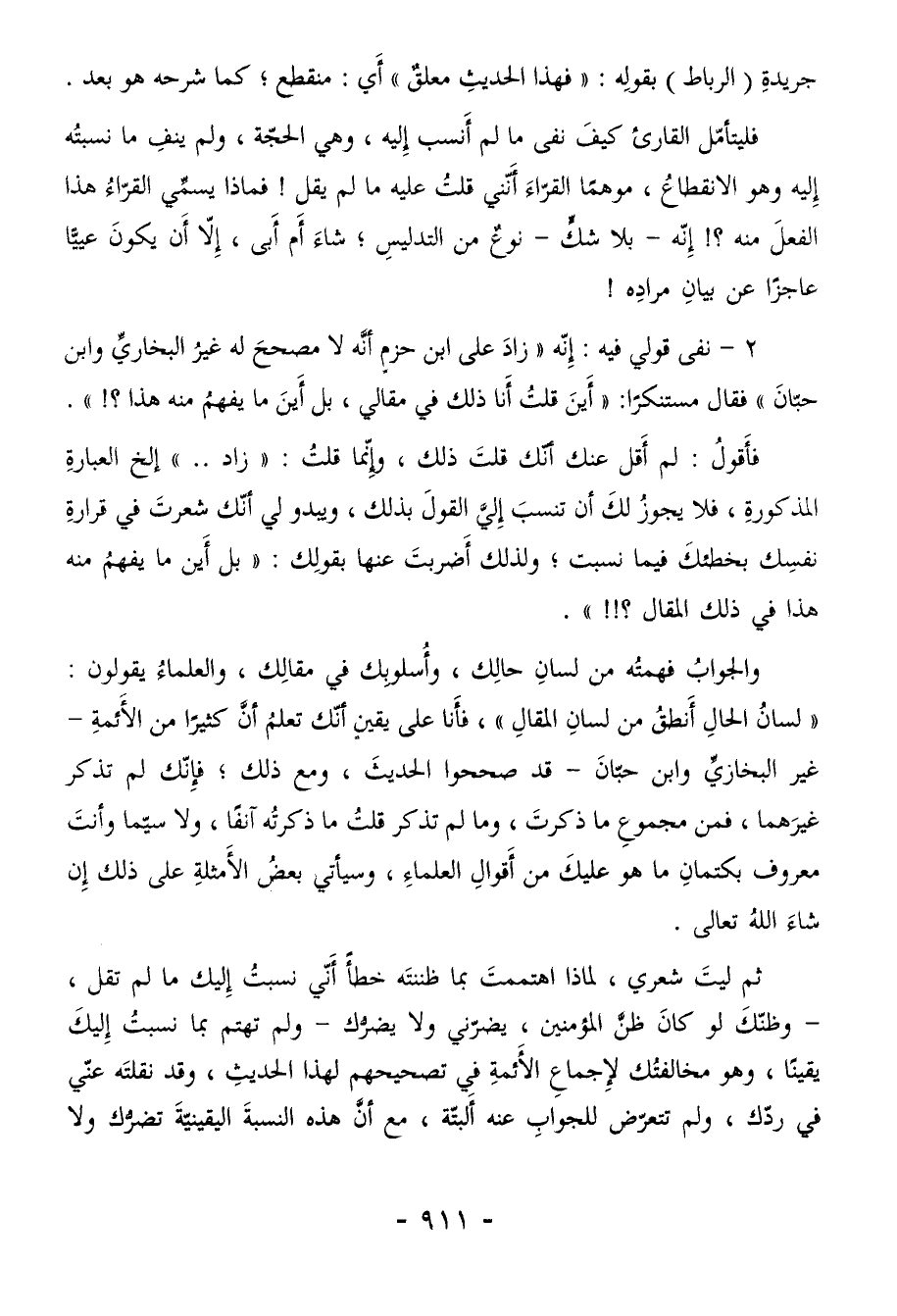 فليتأمّل القارئ كيفَ نفى ما لم أَنسب إِليه، وهي الحجّة، ولم ينفِ ما نسبتُه إِليه وهو الانقطاعُ، موهمًا القرّاءَ أنّني قلتُ عليه ما لم يقل! فماذا يسمِّي القرّاءُ هذا الفعلَ منه؟! إِنّه -بلا شكّ- نوعٌ من التدليسِ، شاءَ أَم أَبى، إِلاّ أَن يكونَ عييًّا عاجزًا عن بيانِ مرادِه!