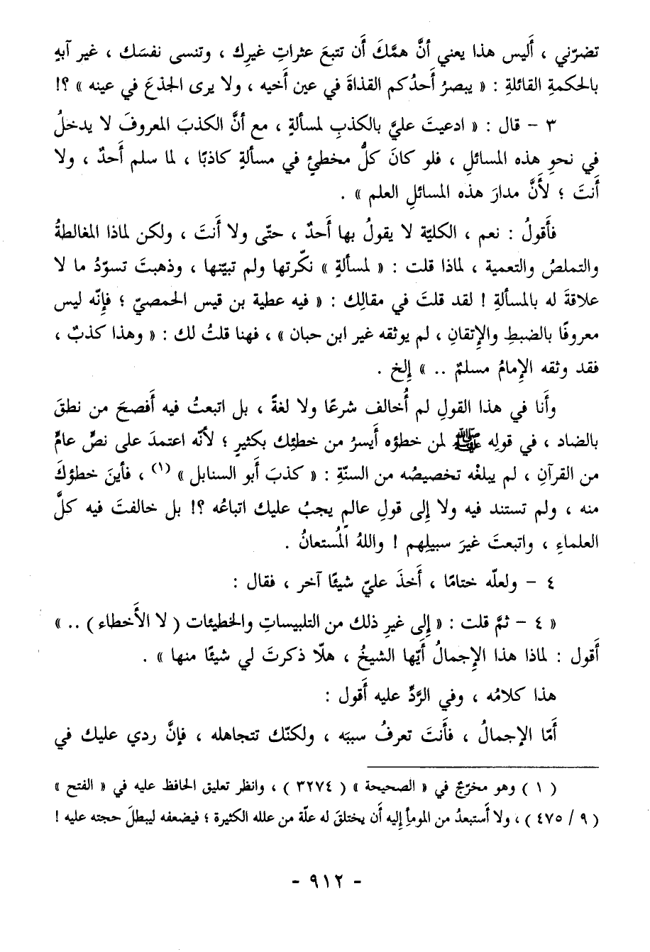 3- قال: "ادعيتَ عليَّ بالكذبِ لمسألةٍ، مع أنَّ الكذبَ المعروفَ لا يدخلُ في نحوِ هذه المسائلِ، فلو كانَ كلُّ مخطئٍ في مسألةٍ كاذبًا، لما سلم أَحدٌ، ولا أَنتَ؛ لأَنَّ مدارَ هذه المسائلِ العلم".