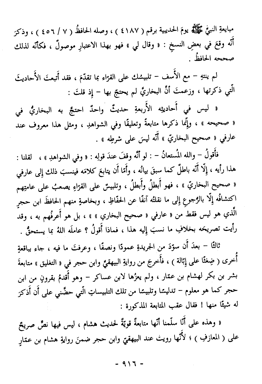 فأَقولُ -والله المسُتعانُ-: لو أنَّه وقفَ عندَ قولِه: "وفي الشواهدِ"، لقلنا: هذا رأيه، إِلاّ أنّه باطلٌ كما سبقَ بيانُه، وأَمّا أَن يتابعَ كلامَه فينسبَ ذلك إِلى عارفي "صحيح البخاريّ"، فهو أَبطلُ وأَبطلُ، وتلبيسٌ على القرّاءِ يصعبُ على عامتِهم اكتشافُه إلاّ بالرجوعِ إِلى ما نقلتُه آنفًا عن الحفّاظِ، وبخاصةٍ منهم الحافظَ ابن حجرٍ الََّذي هو ليس فقط من "عارفي "صحيح البخاري""، بل هو أَعرفُهم به، وقد رأيت تصريحَه بخلافِ ما نسبَ إِليه هذا، فماذا أَقولُ؟ عاملَه اللهُ بما يستحقُّ.