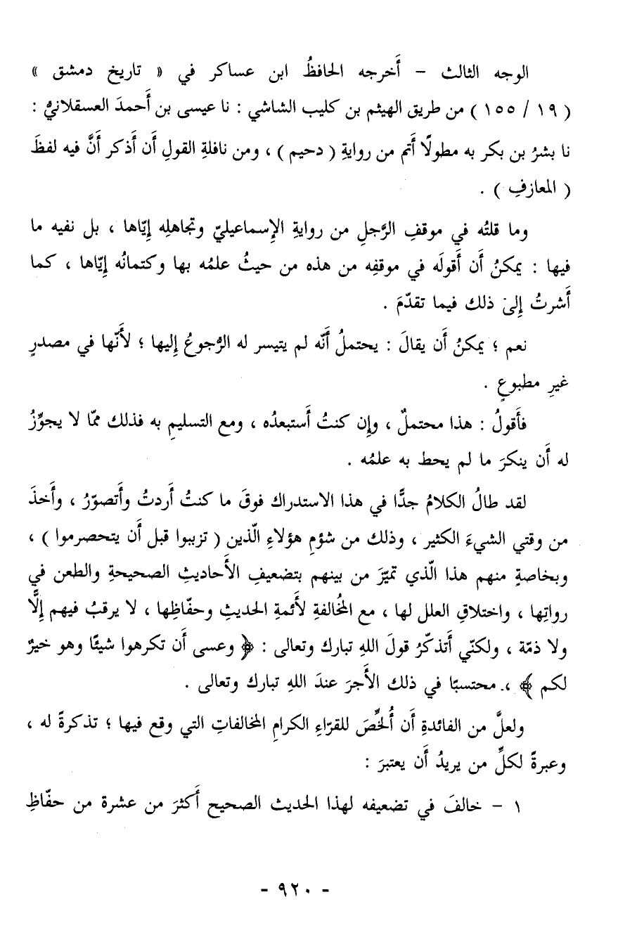 لقد طالُ الكلامُ جدًّا في هذا الاستدراك فوقَ ما كنتُ أَردتُ وأَتصوّرُ، وأَخذَ من وقتي الشيءَ الكثير، وذلك من شؤمِ هؤلاءِ الّذين (تزببوا قبل أَن يتحصرموا) ، وبخاصةٍ منهم هذا الّذي تميّزَ من بينهم بتضعيفِ الأَحاديثِ الصحيحةِ والطعن في رواتِها، واختلاقِ العلل لها، مع المخُالفةِ لأَئمةِ الحديثِ وحفّاظِها، لا يرقبُ فيهم إِلاًّ ولا ذمّة، ولكنّي أَتذكّرُ قولَ اللهِ تبارك وتعالى: {وَعَسَى أَنْ تَكْرَهُوا شَيْئًا وَهُوَ خَيْرٌ لَكُمْ} ، محتسبًا في ذلك الأَجرَ عندَ اللهِ تبارك وتعالى.