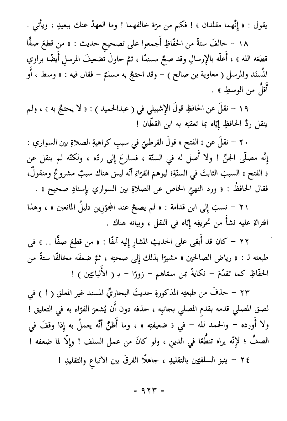 21- نسبَ إِلى ابن قدامة: "لم يصحَّ عند المجوّزِين دليلُ المانعين"، وهذا افتراءٌ عليه نشأَ من تحريفِه إِيّاه في النقل، وبيانه هناك.