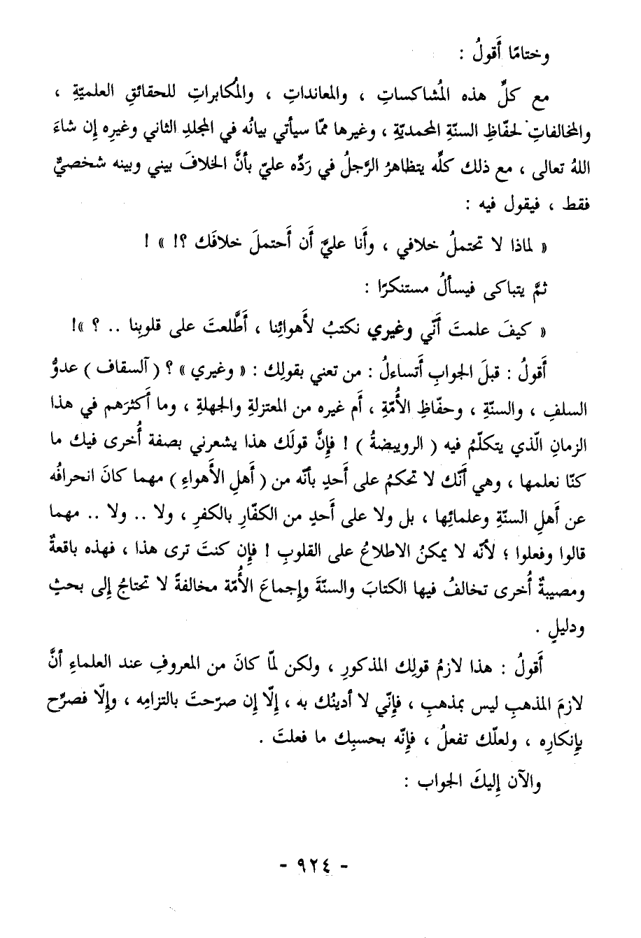 أقولُ: هذا لازمُ قولِك المذكورِ، ولكن لمّا كانَ من المعروفِ عند العلماءِ أنَّ لازمَ المذهبِ ليس بمذهبِ، فاٍنّي لا أدينُك به، إلاّ إِن صرّحتَ بالتزامِه، وإِلاّ فصرِّح بإنكارِه، ولعلّك تفعلُ، فإِنّه بحسبِك ما فعلتَ.