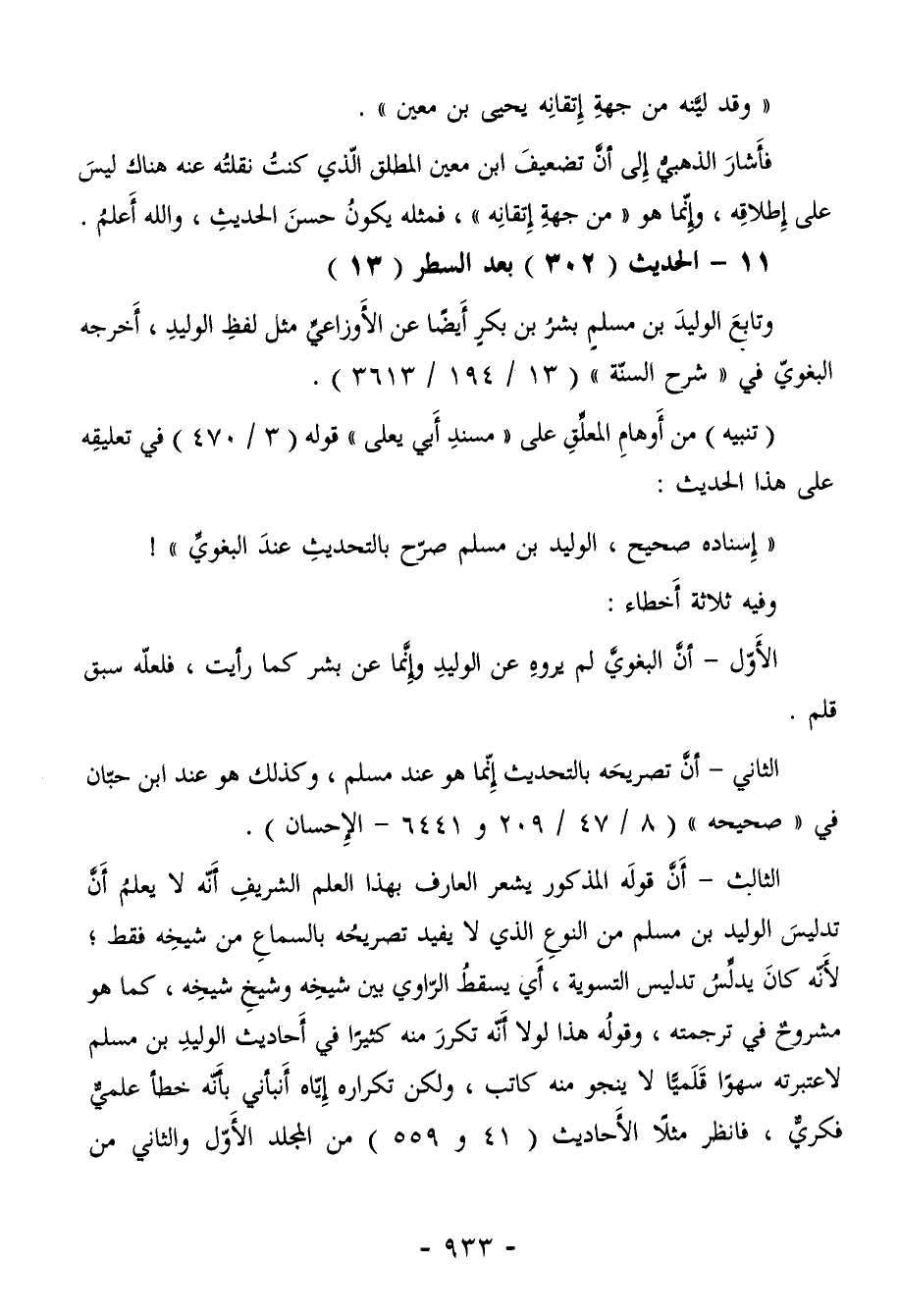 الثالث - أَنَّ قولَه المذكور يشعر العارف بهذا العلم الشريفِ أنّه لا يعلمُ أَنَّ تدليسَ الوليد بن مسلم من النوعِ الذي لا يفيد تصريحُه بالسماعِ من شيخِه فقط؛ لأنّه كانَ يدلِّسُ تدليس التسوية، أي يسقطُ الرّاوي بين شيخِه وشيخِ شيخِه، كما هو مشروحٌ في ترجمته، وقولُه هذا لولا أنّه تكررَ منه كثيرًا في أحاديث الوليدِ بن مسلم لاعتبرته سهوًا قَلَميًّا لا ينجو منه كاتب، ولكن تكراره إِيّاه أنبأني بأنّه خطأٌ علميٌّ فكريٌّ، فانظر مثلاً الأَحاديث (41 و559) من المجلد الأَوّل والثاني من