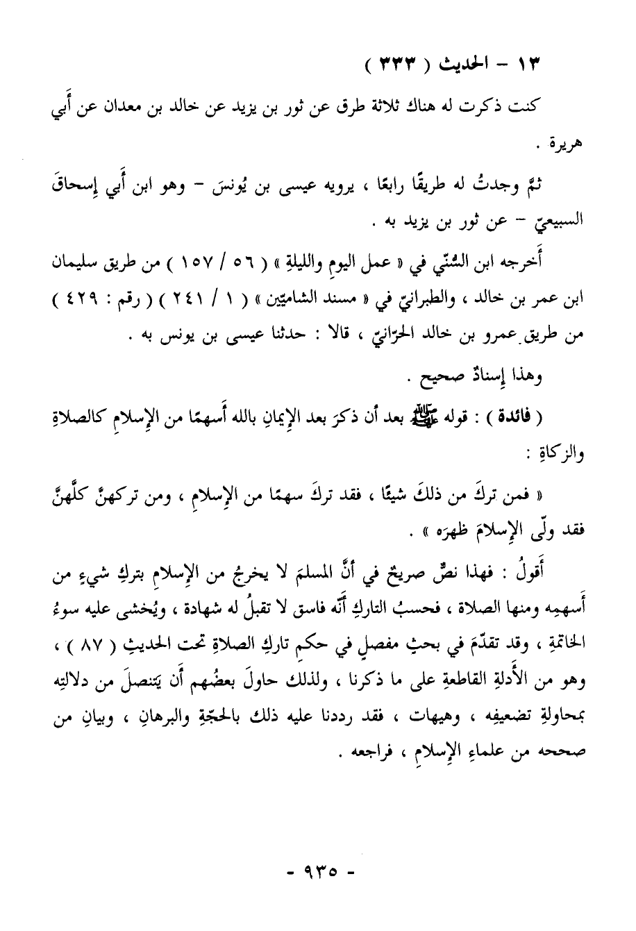 أَقولُ: فهذا نصٌّ صريحٌ في أنَّ المسلمَ لا يخرجُ من الأِسلامِ بتركِ شيءٍ من أَسهمِه ومنها الصلاة، فحسبُ التاركِ أنّه فاسق لا تقبلُ له شهادة، ويُخشى عليه سوءُ الخاتمةِ، وقد تقدّمَ في بحثٍ مفصلٍ في حكمِ تاركِ الصلاةِ تحت الحديثِ (87) ، وهو من الأَدلةِ القاطعةِ على ما ذكرنا، ولذلك حاولَ بعضُهم أَن يَتنصلَ من دلالتِه بمحاولةِ تضعيفِه، وهيهات، فقد رددنا عليه ذلك بالحجّةِ والبرهانِ، وبيانِ من صححه من علماءِ الإِسلامِ، فراجعه.