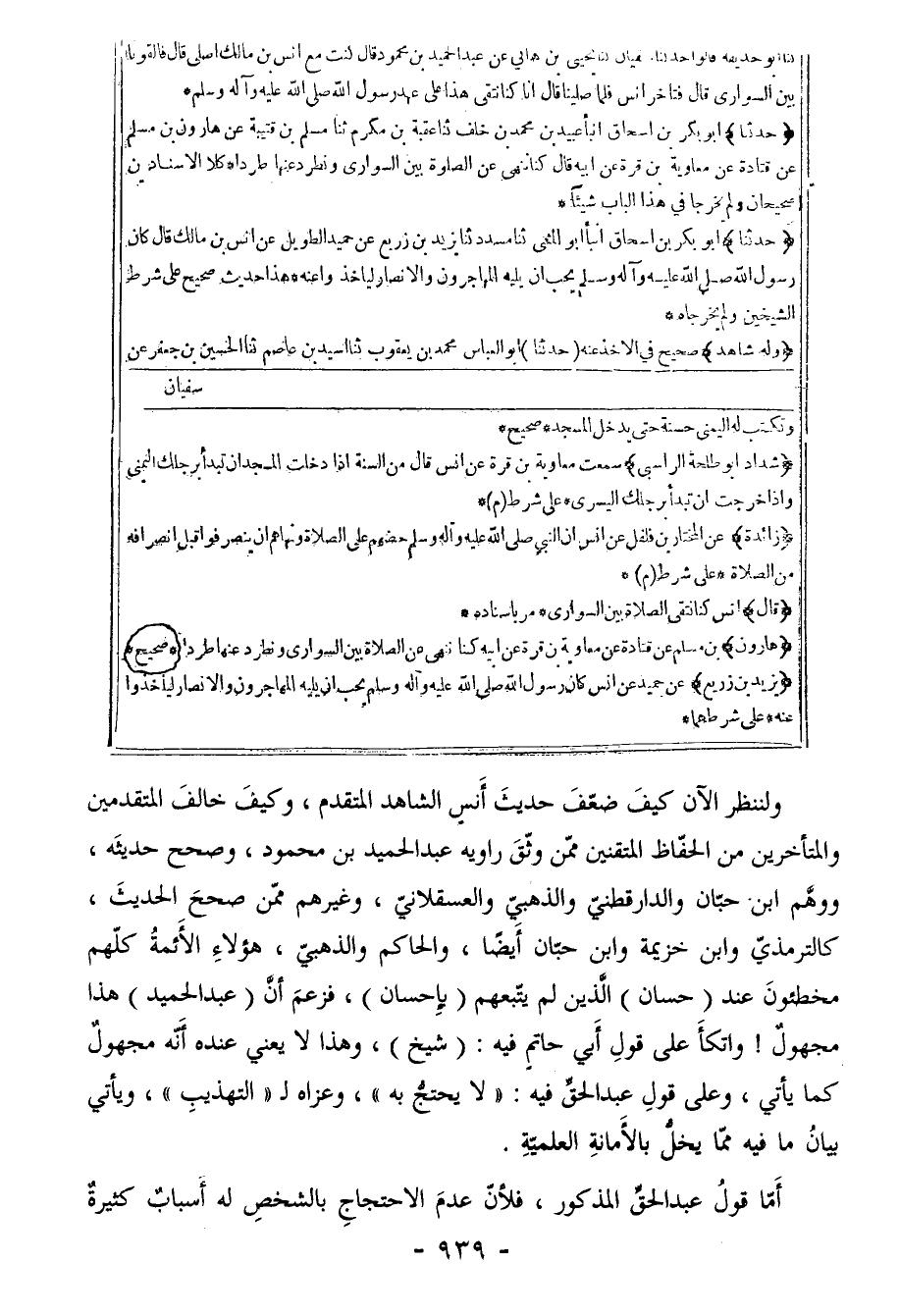 ولننظر الآن كيفَ ضعّفَ حديثَ أَنسٍ الشاهد المتقدم، وكيفَ خالفَ المتقدمين والمتأخرين من الحفّاظ المتقنين ممّن وثّقَ راويه عبد الحميد بن محمود، وصحح حديثَه، ووهَّم ابن حبّان والدارقطنيّ والذهبيّ والعسقلانيّ، وغيرهم ممّن صححَ الحديثَ، كالترمذيّ وابن خزيمة وابن حبّان أيضًا، والحاكم والذهبيّ، هؤلاءِ الأَئمةُ كلّهم مخطئونَ عند (حسان) الّذين لم يتّبعهم (بإحسان) ، فزعمَ أنَّ (عبد الحميد) هذا مجهولٌ! واتكأَ على قولِ أبي حاتمٍ فيه: (شيخ) ، وهذا لا يعني عنده أنّه مجهولٌ كما يأتي، وعلى قولِ عبد الحقِّ فيه: "لا يحتجُّ به"، وعزاه لـ "التهذيبِ"، ويأتي بيانُ ما فيه ممّا يخلُّ بالأَمانةِ العلميّةِ.