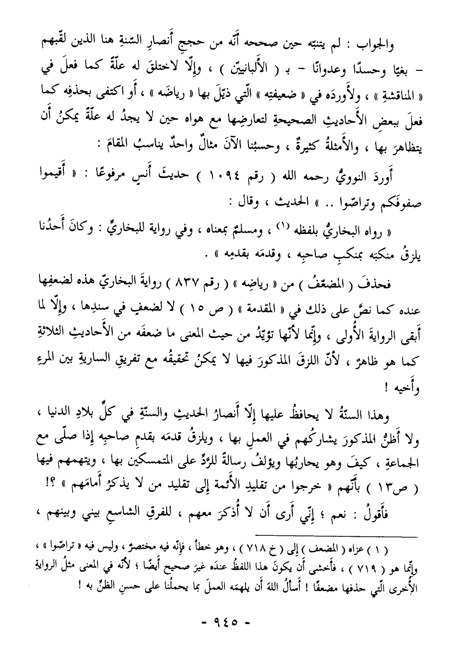 والجواب: لم يتنبّه حين صححه أنّه من حججِ أَنصارِ السّنةِ هنا الذين لقّبهم -بغيًا وحسدًا وعدوانًا- بـ (الأَلبانييّن) ، وإِلاّ لاختلقَ له علّةً كما فعلَ في "المناقشةِ"، ولأَوردَه في "ضعيفتِه" الّتي ذيّلَ بها "رياضَه"، أَو اكتفى بحذفِه كما فعلَ ببعضِ الأَحاديثِ الصحيحةِ لتعارضِها مع هواه حين لا يجدُ له علّةَ يمكنُ أَن يتظاهرَ بها، والأَمثلةُ كثيرةٌ، وحسبُنا الآنَ مثالٌ واحدٌ يناسبُ المقامَ: