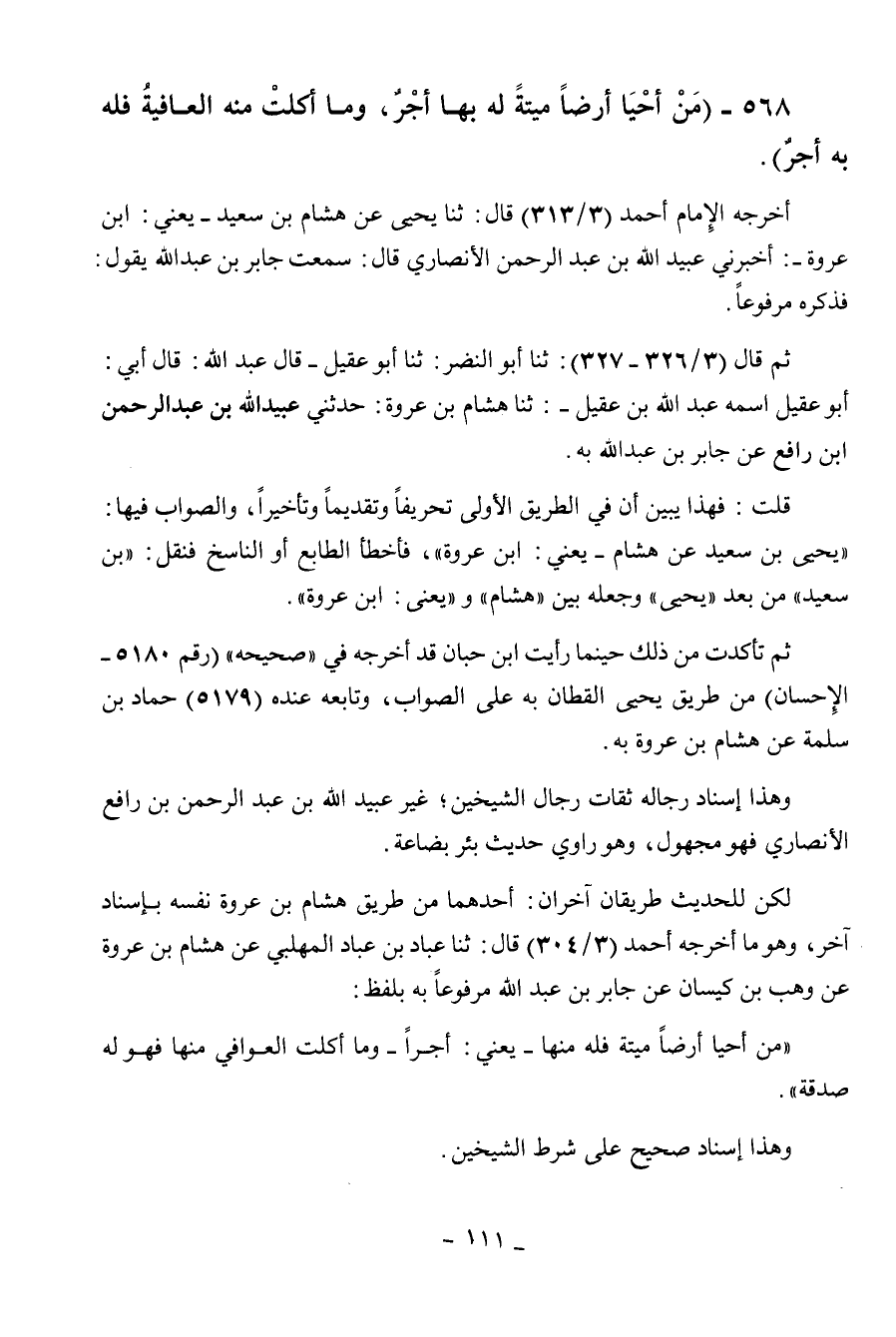 568 - " من أحيا أرضا ميتة له بها أجر وما أكلت منه العافية فله به أجر ".