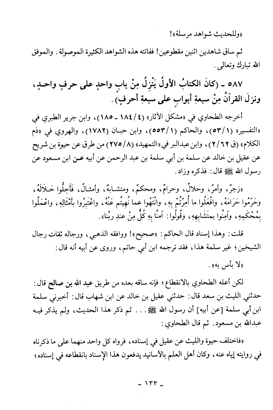 587 - " كان الكتاب الأول ينزل من باب واحد على حرف واحد ونزل القرآن من سبعة أبواب