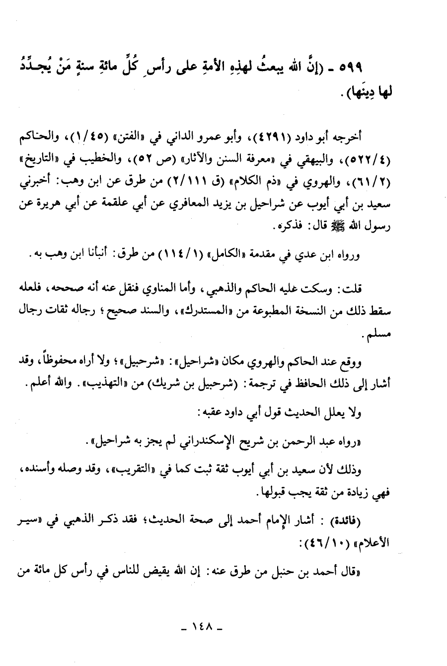 599 - " إن الله يبعث لهذه الأمة على رأس كل مائة سنة من يجدد لها دينها ".