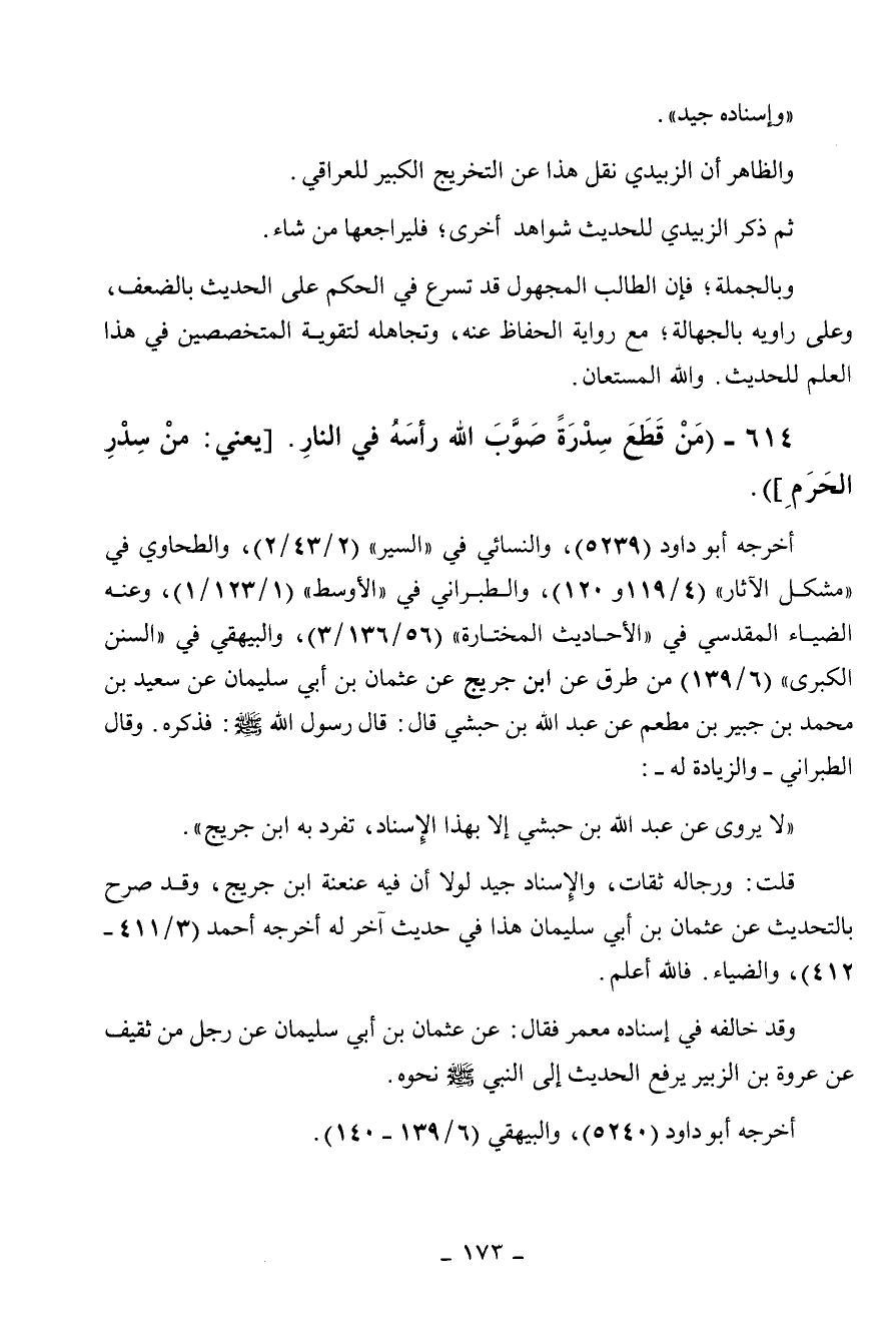 614 - " من قطع سدرة صوب الله رأسه في النار (يعني من سدر الحرم) ".