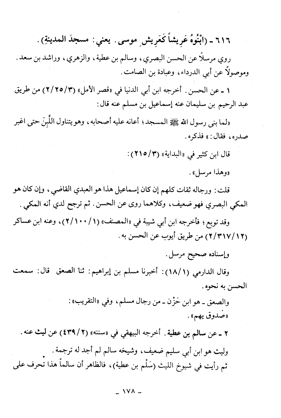 616 - " ابنوه عريشا كعريش موسى. يعني مسجد المدينة ".