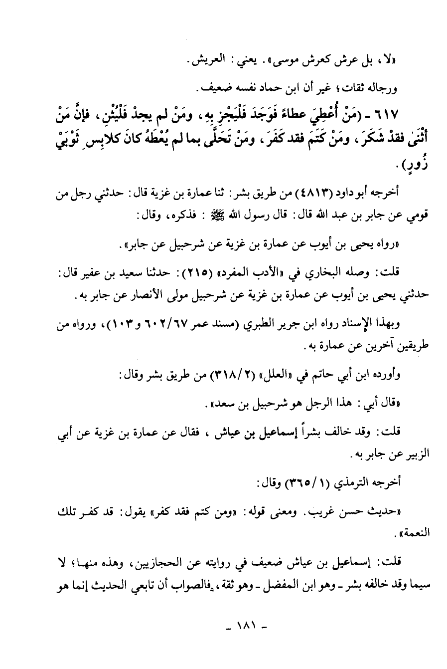 617 - " من أعطي عطاء فوجد فليجز به ومن لم يجد فليثن، فإن من أثنى فقد شكر ومن