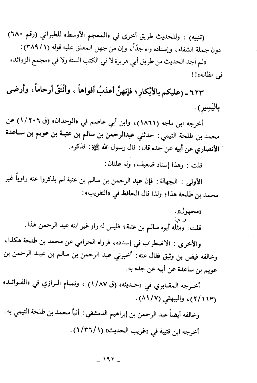 قلت: وهذا إسناد ضعيف، وله علتان: الأولى: الجهالة: فإن عبد الرحمن بن