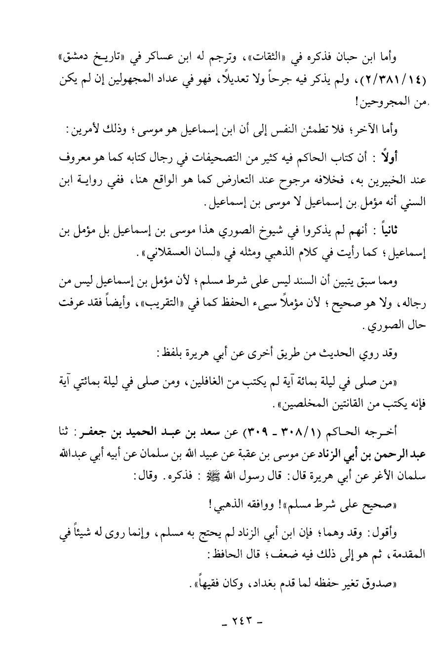 وأما الآخر، فلا تطمئن النفس إلى أن ابن إسماعيل هو موسى وذلك لأمرين: