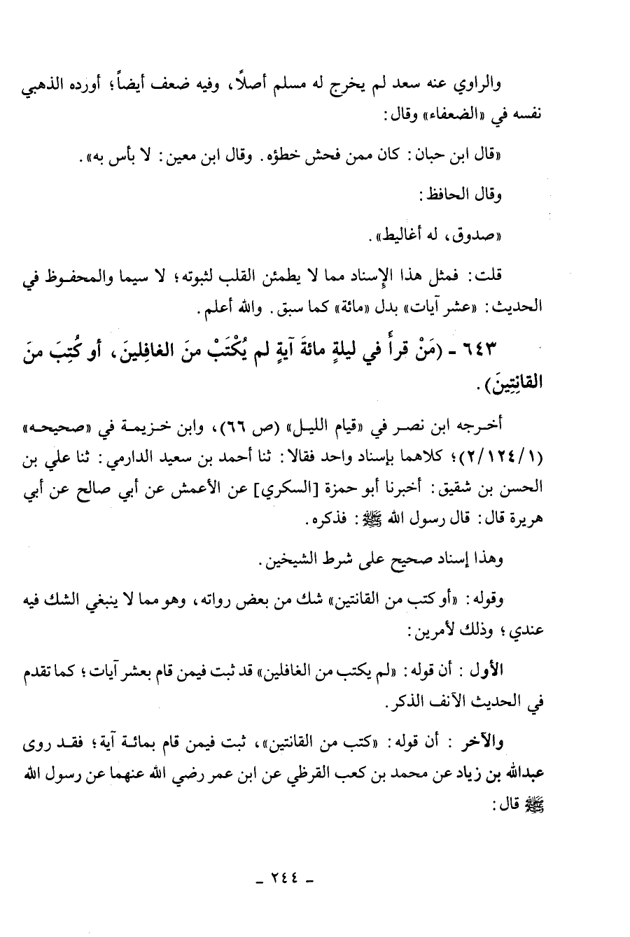 643 - " من قرأ في ليلة مائة آية لم يكتب من الغافلين، أو كتب من القانتين ".