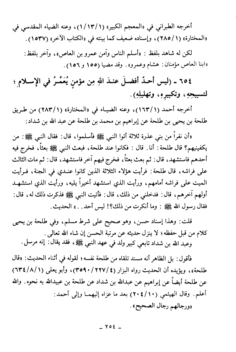 654 - " ليس أحد أفضل عند الله من مؤمن يعمر في الإسلام، لتسبيحه وتكبيره وتهليله